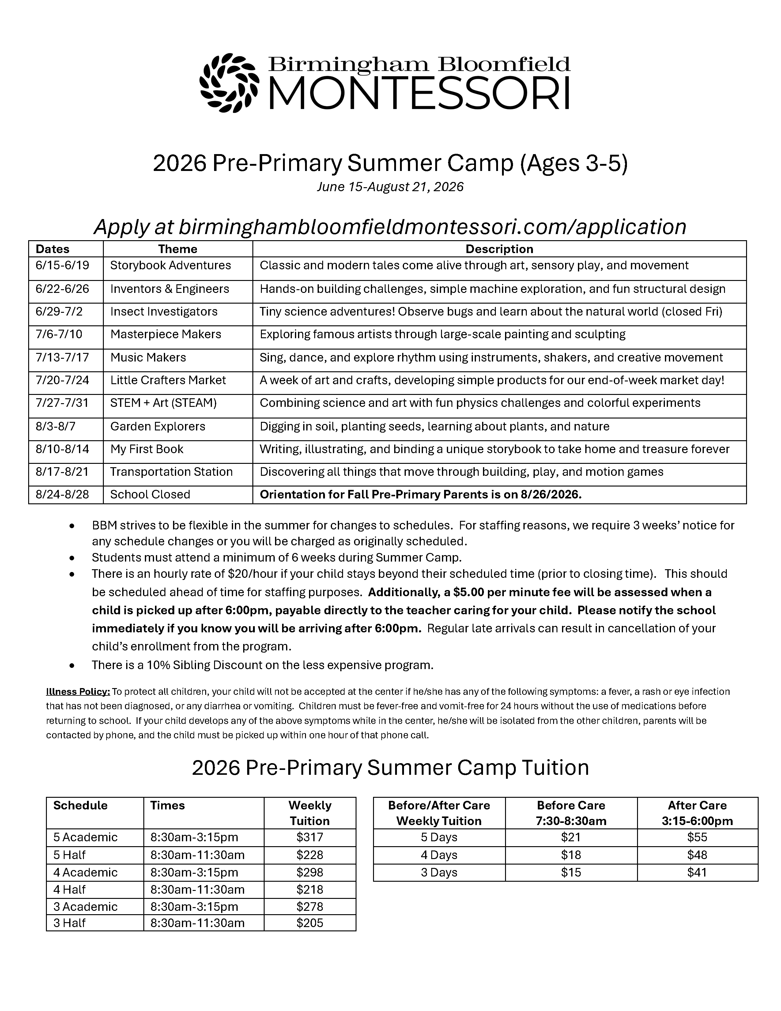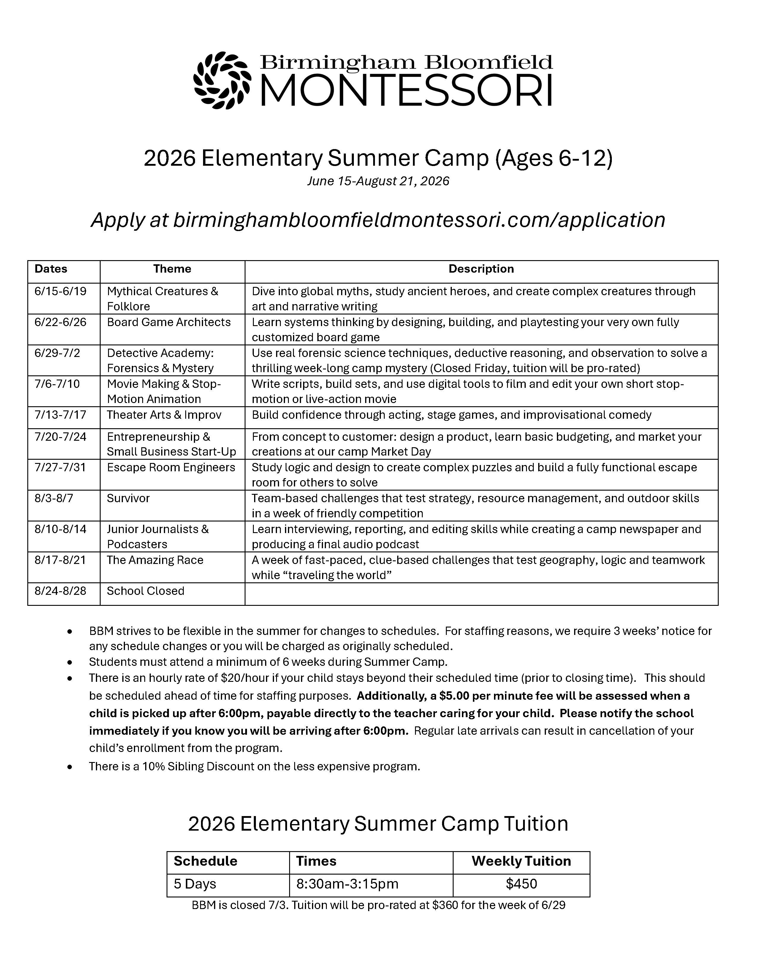 BBM offers a 10 week Summer Camp for Preschool/Kindergarten and Elementary students. Check out our fun themes below! There is a 6-week minimum to attend, and we have many in-house field trips planned! Apply at birminghambloomfieldmontessori.com/application !